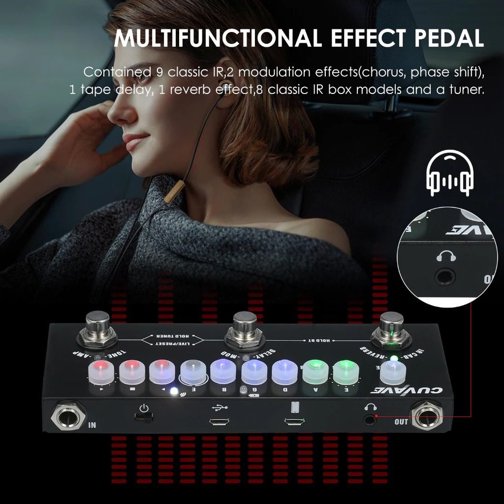 [Pedal de efeito multifuncional] continha 9 IR clássico, 2 efeitos de modulação (Chorus, mudança de fase), 1 fita DeLay, 1 efeito reverb, 8 modelos clássicos IR box e um sintonizador.